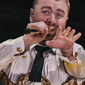 Helt forrest på scenen stod sangerinden, Cat Burns (bl.a. kendt fra nummeret ”go”). Med appel og karisma gav hun et lille kvarters opvarmning forud for den næste halve times den mørklagte scene, hvorfra noget bastunge poptracks fra andre kunstnere kom.Tilsløret af enorme hvide klæder i scenens fulde bredde afsløredesen gigantisk, gylden kvinde - liggende på siden som en græsk gudinde - som æstetisk og effektfuldt sceneelement. Enten vaklede Sam vokalt eller også gav han nogle af fraseringerne på åbneren, ”Stay with me”, liiidt ekstra. Igennem endnu to (også) lidt banale skæringer fra albummet, ”In the Lonely Hour” (2014), kom en nærværende Sam omkring det væsentlige med ynde: Den mulige aflysning af koncerten som følge af et svært maveonde op til og koncertens budskab om frihed, hvorefter han sluttede på: "This is a safe space, get freaky and have a good time". En autentisk, ydmyg og varm stjerne, som sidst var i Danmark i 2018.